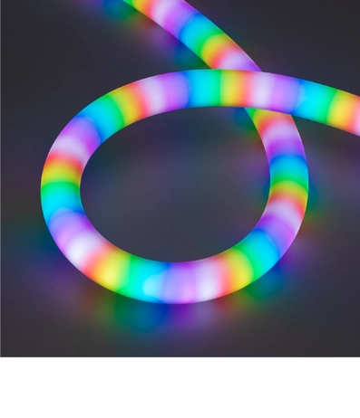 Гибкий неон MOONLIGHT диаметром 25 мм в черной оболочке обладает равномерным свечением, направленным на 360°. С помощью MOONLIGHT D25 можно создать локальное и декоративное освещение, а также оригинальные арт-объекты. 3D-инсталляции на основе круглого гибкого неона гармонично впишутся в интерьеры объектов HoReCa и другие коммерческие пространства, а также в локации, где можно гармонично использовать многоцветность.